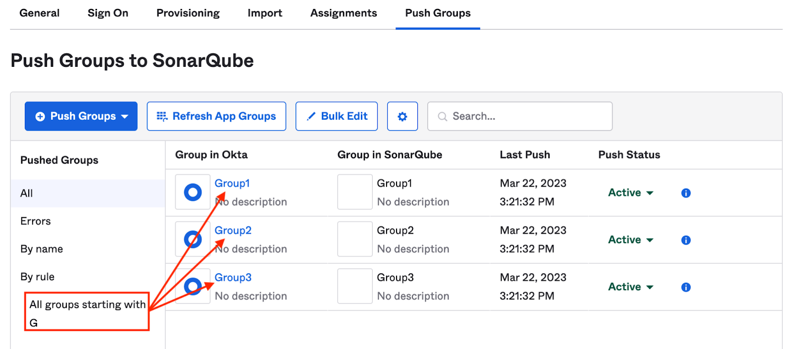 - create a rule to match multiple groups at once. Click + Push Groups > Find groups by rule, give it the name and the criteria of your choice, then click Create rule. Note that Okta does not support regular expressions here and that matching groups are immediately provisioned when the rule is created.