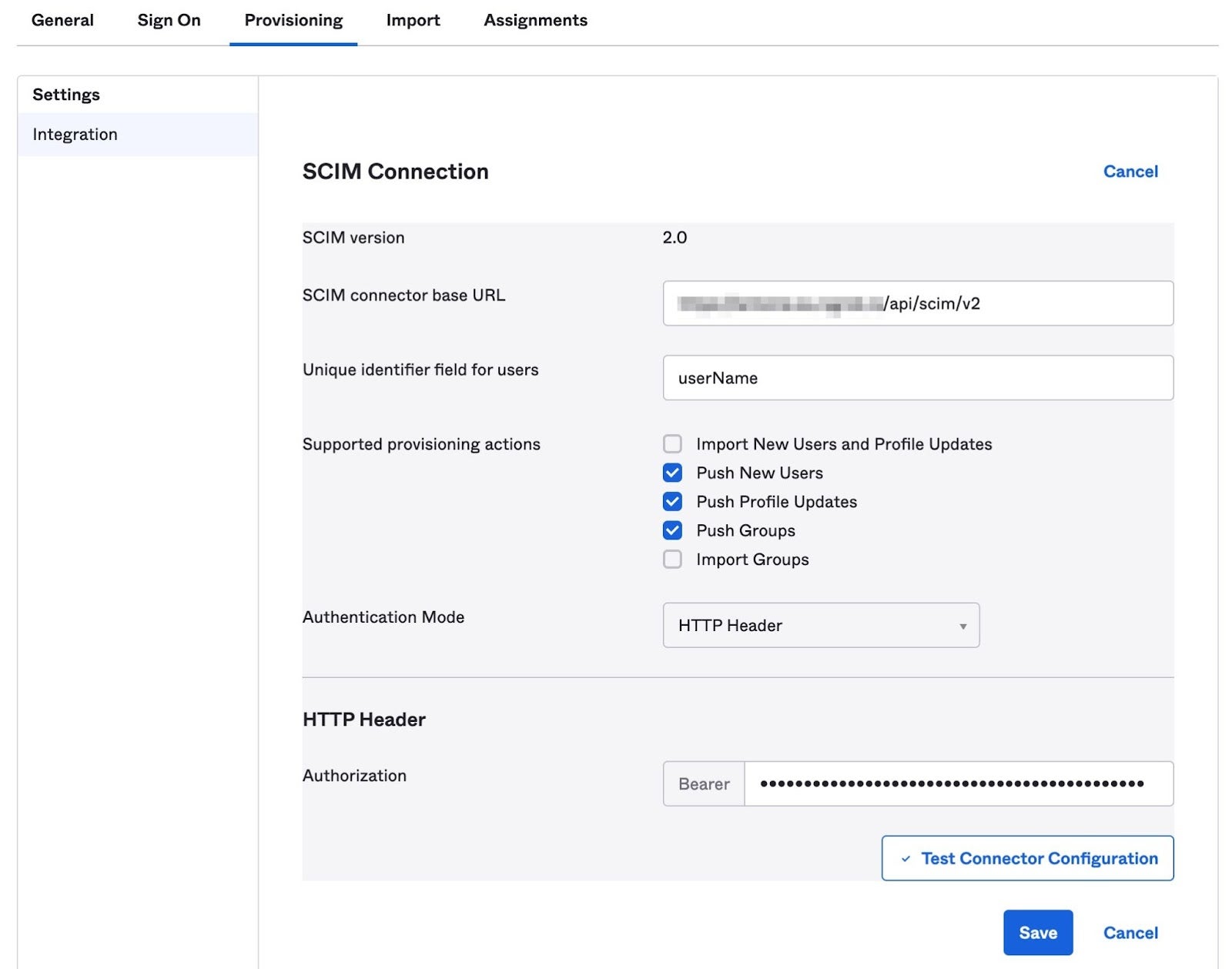 Step 7: To check that the SCIM connection is valid, click on Test Connector Configuration. A green checkmark indicates that all the fields are properly filled.